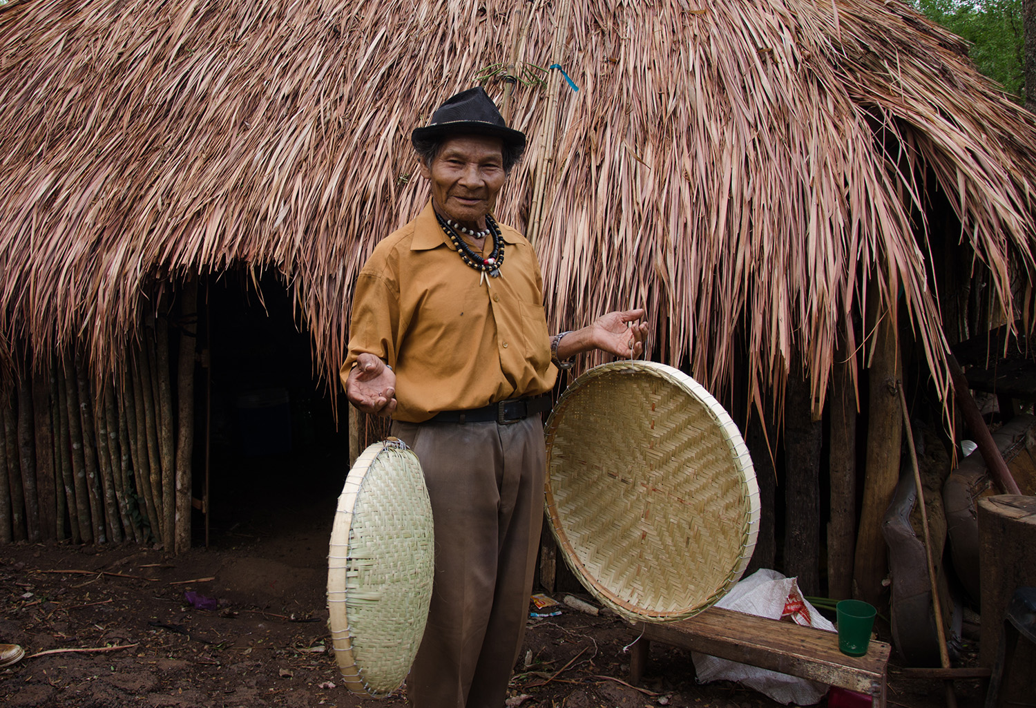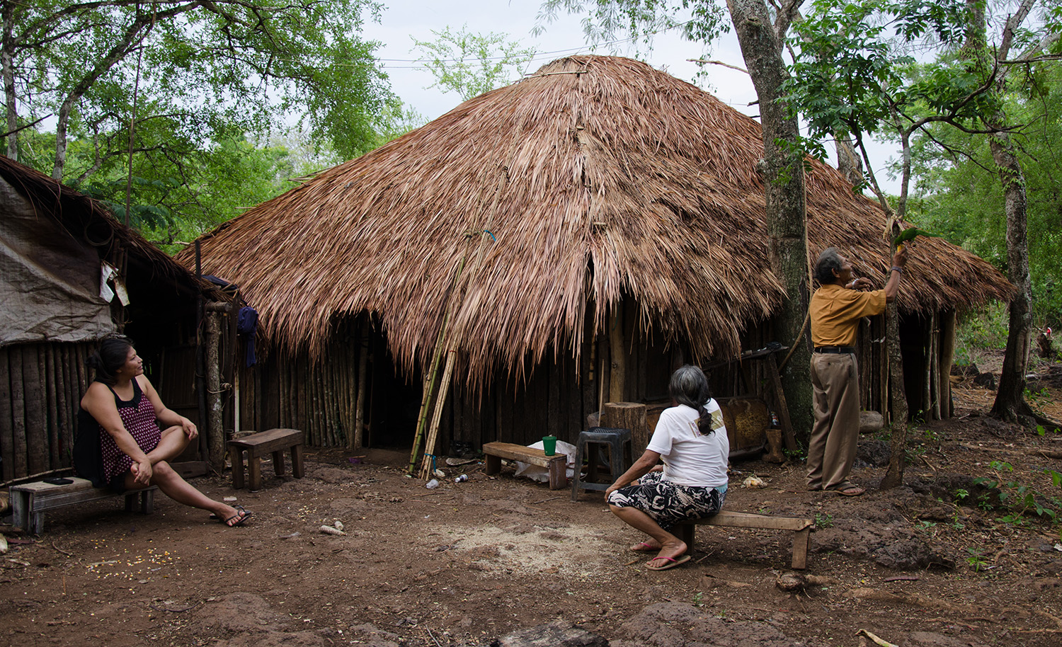 Da porteira da fazenda, menos de um quilômetro de estrada antecedem a chegada ao centro da aldeia Laranjeira Ñanderu. A trilha, que se segue em meio à plantação de milho, direciona à casa de reza, uma grande cabana de sapé construída pela comunidade para receber os rituais e rezas tradicionais dos Kaiowá. Quando chegamos na propriedade que abrange o tekoha, logo fomos recebidas pelo filho do dono da fazenda. O homem de meia idade pareceu incomodado com a nossa presença, tentou justificar que não é uma pessoa ruim e que não quer prejudicar os indígenas abrigados a poucos metros dali. Investigações do Ministério Público Federal em Mato Grosso do Sul (MPF/MS) apontam o contrário, que os proprietários impuseram empecilhos para a entrada de pessoas na fazenda, desde membros da Funai até agentes de saúde, o que impedia o atendimento médico e policial, o transporte escolar e a distribuição de remédios e alimentos.